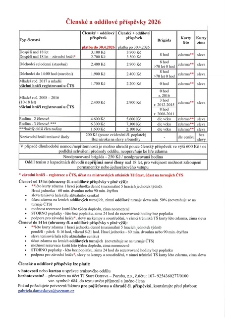 ČLENSKÉ A ODDÍLOVÉ PŘÍSPÉVKY 2026